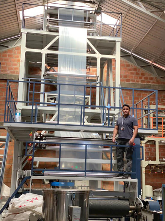 玻利維亞拉巴茲當(dāng)?shù)匾患倚⌒鸵?guī)模吹膜廠,從我們PLASTAR公司購(gòu)買(mǎi)過(guò)2臺(tái)吹膜機(jī),一臺(tái)單層1000mm吹膜機(jī),另一臺(tái)為單層1500mm吹膜機(jī)??蛻魶](méi)要求我們派遣工程師,全部都由客戶自行組裝,并且試機(jī)驗(yàn)收。目前機(jī)器運(yùn)轉(zhuǎn)良好,客戶主要做大型食品袋子和貨物袋子。